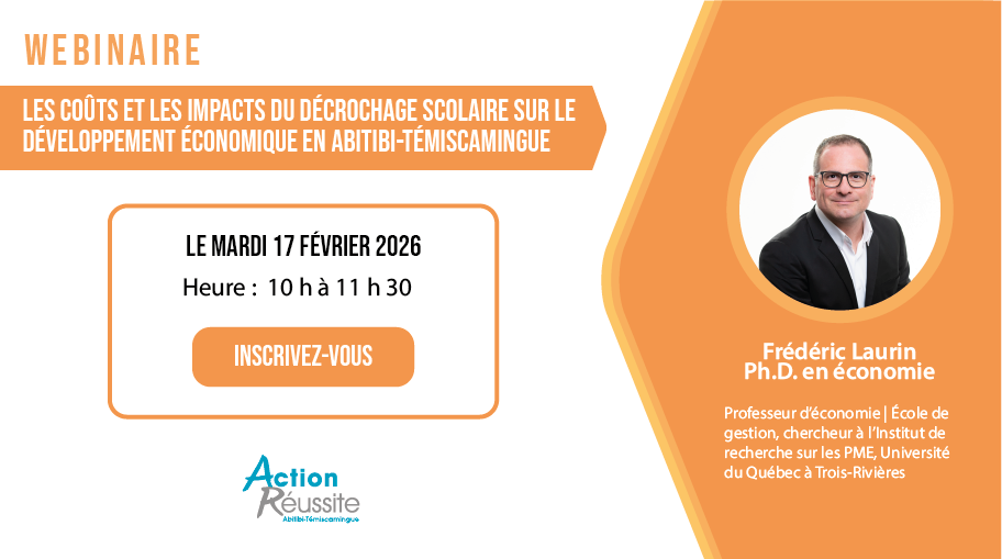 Présentation de l'étude sur les coûts et les impacts du décrochage scolaire sur le développement économique en Abitibi-Témiscamingue par Monsieur Frédéric Laurin, PhD en économie, consultant indépendant et professeur en économie à l’Université du Québec à Trois-Rivières.