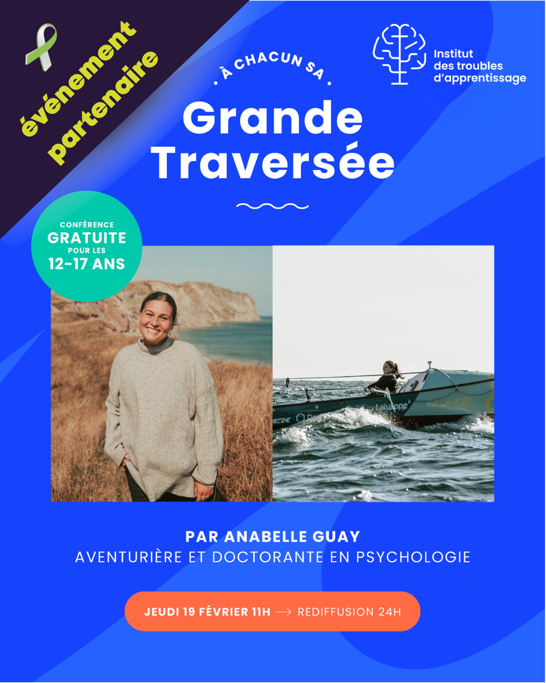 Dans le cadre des Journées de la persévérance scolaire, l’Institut TA offre gratuitement aux élèves de 12-17 ans une conférence inspirante d’Anabelle Guay, aventurière et doctorante en psychologie. Présentée le jeudi 19 février à 11h, la conférence sera également disponible en rediffusion pendant 24 heures.