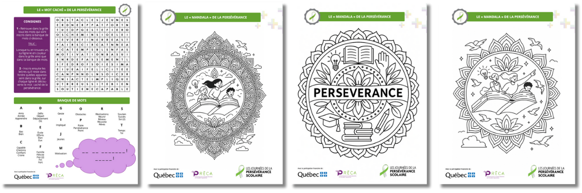 Nouveautés cette année : trois mandalas adaptés à différentes tranches d’âge et un mot croisé sur le thème de la persévérance scolaire.