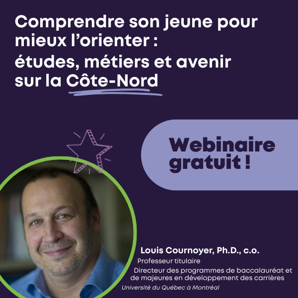 Ce webinaire vous propose un moment pour réfléchir, échanger et vous outiller. Vous repartirez avec des repères clairs pour soutenir un parcours réaliste, motivant et enraciné sur la Côte-Nord, que votre jeune choisisse le DEP, le cégep, l’université ou une autre voie.