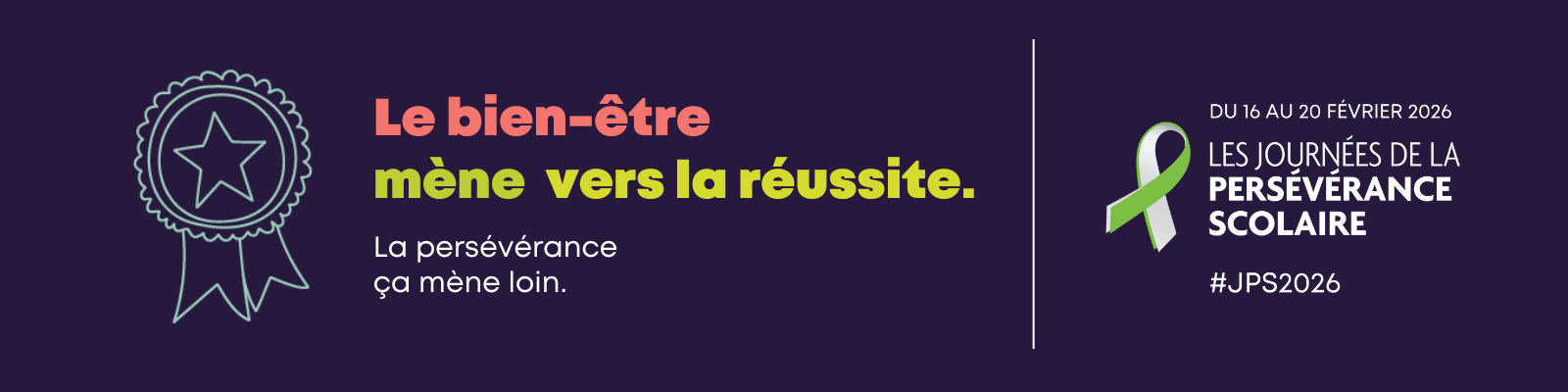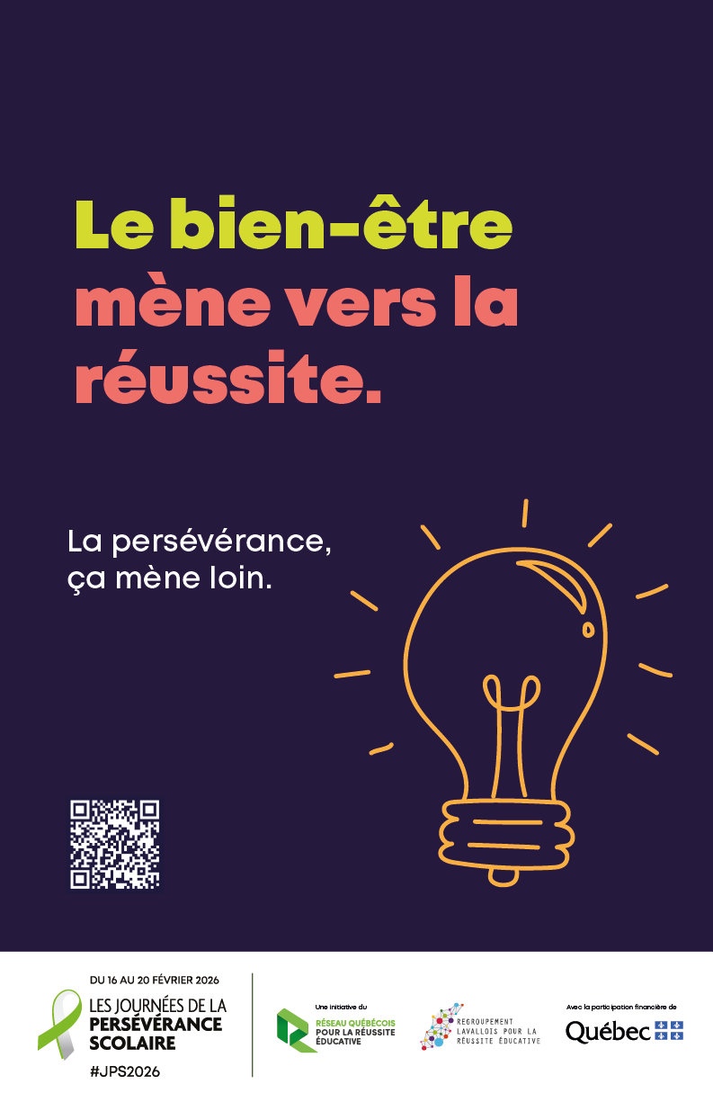Cette affiche met en lumière le lien essentiel entre le bien-être et la réussite éducative. En valorisant l’équilibre, le soutien et le sentiment de sécurité, elle rappelle que se sentir bien est un levier fondamental pour persévérer et réussir.