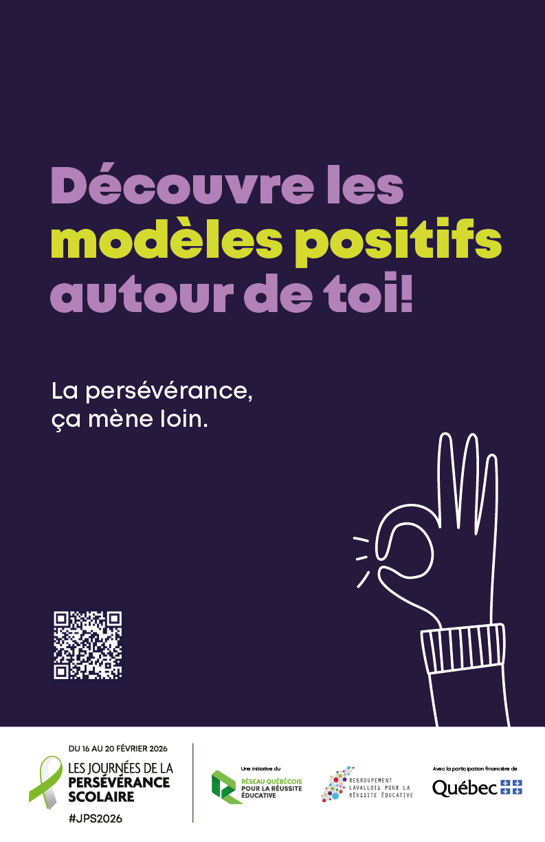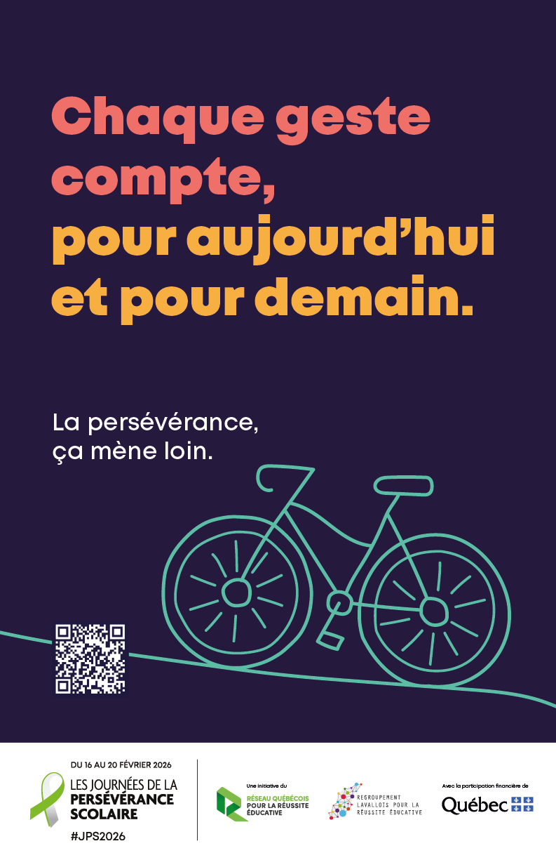 Cette affiche met de l’avant la force des petits gestes quotidiens. Elle rappelle que chaque action, aussi simple soit-elle, contribue à la persévérance scolaire et à la réussite collective.
