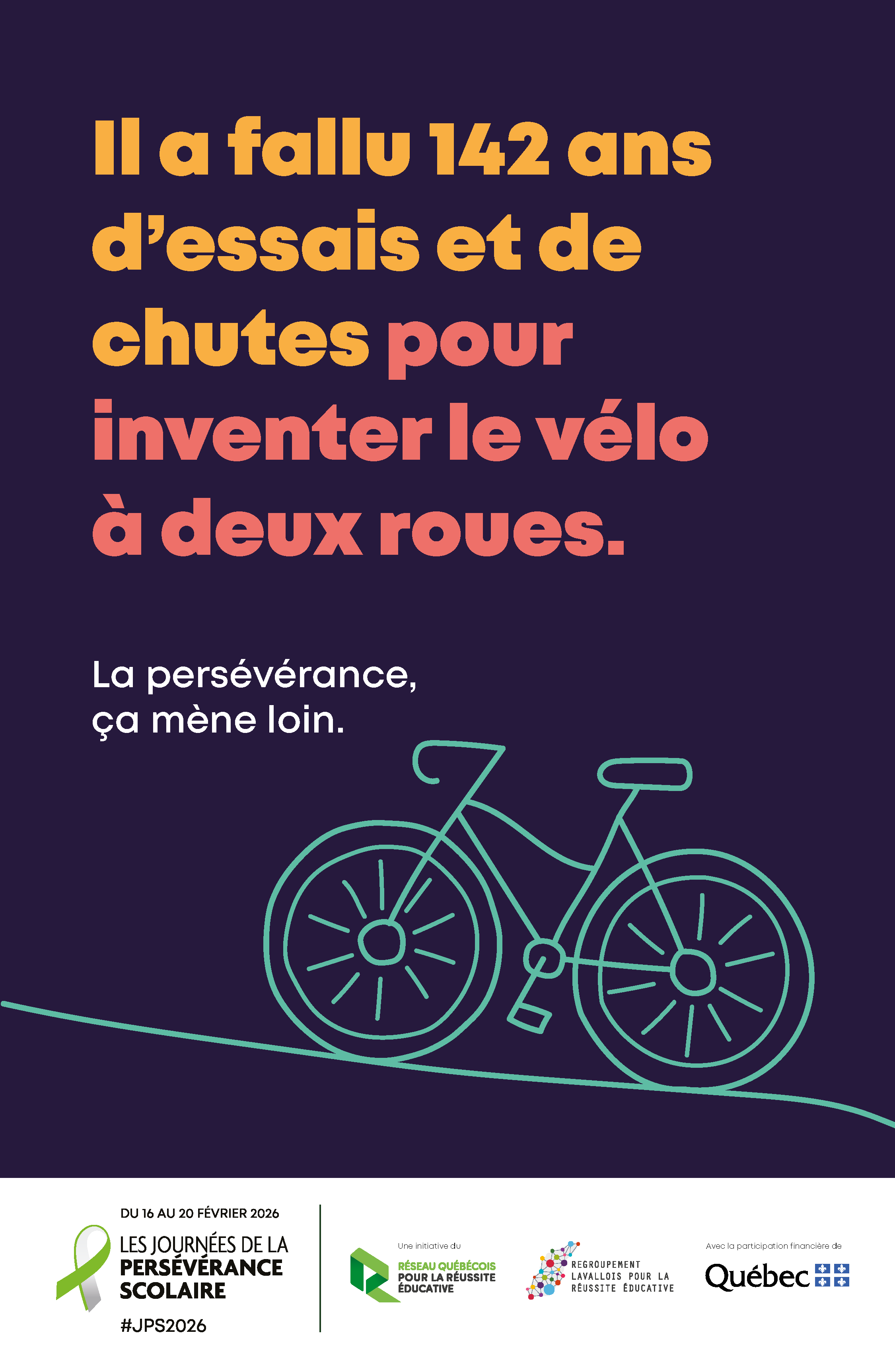 Une affiche inspirante rappelant qu’il a fallu 142 ans d’essais, de chutes et de persévérance pour inventer le vélo à deux roues. Un message puissant pour encourager les jeunes à continuer malgré les obstacles.